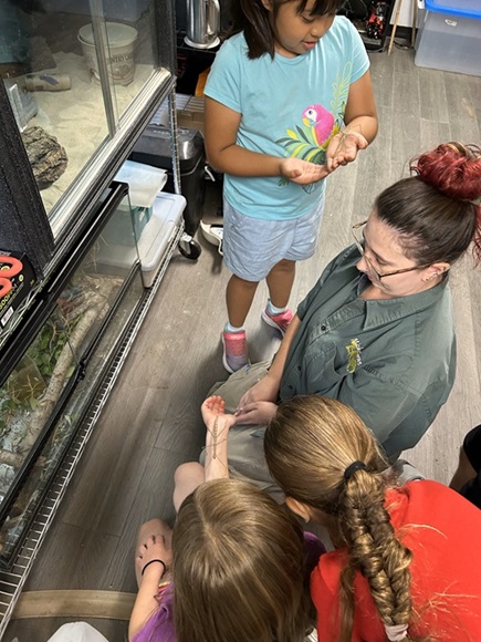 Events and at schools: Education staff members set up tables with bio facts and share information on the pet trade, illegal hunting, forest fragmentation and its conservation impacts, and some information about our animal residents.