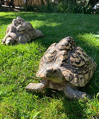 Breeding in Leopard Tortoises takes place from May to October. Males exhibit courtship behaviors and vocalizations to attract females and are known to aggressively compete with other males for females. They largely vocalize during the breeding season to warn off competitors. Females dig holes in the ground and lay five to 30 eggs in this nest covering them up at once. Tortoises do not incubate their eggs nor practice parental care. In the wild, hatchlings have to fend for themselves and are heavily predated upon.