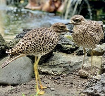 Cape Thick-knees often live near water and are closely related to plovers, sandpipers, gulls, and skimmers. They have long legs and their feathers are speckled with dark brown and white colors. They were named “thick-knee” since their knees are thicker than the rest of their thin legs. Since they are ground-dwelling birds, their colors mimic their surroundings helping them hide from their predators (camouflage). They have yellow-colored pupils and the base of their beaks is also yellow while the rest of the beak is black. They are active by night (nocturnal) and they are known to sit on the ground during the day to hide from their predators. They are approximately a foot in body length and are very light in weight (1 pound).