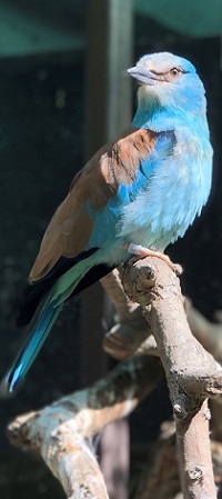 European Rollers are closely related to kingfishers and bee-eaters. These birds are very colorful with their plumage being bright blue with black beaks. They have featherless black patches around their eyes. Their tail feathers have a diversity of colors that include midnight blue, dark and light blues with the tips being white and black. Their backs a covered with brownish-orange colored feathers with midnight blue closer to the tail end. Their wings also have an assortment of colors from midnight blue, dark, and light blues with the tips being white below the wings and black on top of the wings. Males and females are of the same color, shape, size, and form (monomorphous). These rollers are around a foot in body length with a two-foot wingspan. They are very light in weight weighing less than half a pound.