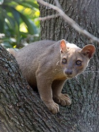 The fossa is closely related to weasels and mongooses. They are carnivores and sport several attributes that are similar to wild dogs and wild cats. They have glistening dark brown fur that helps camouflage them when they are out hunting prey. Like wild cats, the fossa has long bodies and equally long tails. As they spend a considerable proportion of their time in trees, their long tails help them balance when climbing trees and tree branches. Fossas also have flexible ankles that help them maneuver smoothly while climbing trees. With these ankles, they are also able to climb down head first. While wild cats have claws that retract, the fossa has semi-retractable claws. Like wild dogs, fossa has slanted, long, pointed snouts with whiskers. The fossa is active by night and depends on their advanced sense of sight, hearing, and smell to hunt their prey.