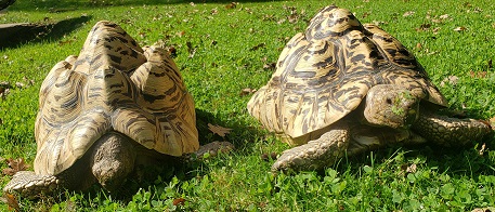 African leopard tortoises, Nikki and Lightning are siblings and they are animal ambassadors. They are very popular with zoo visitors, especially school groups. Due to their popularity and infectious personalities, they often participate in education programs.