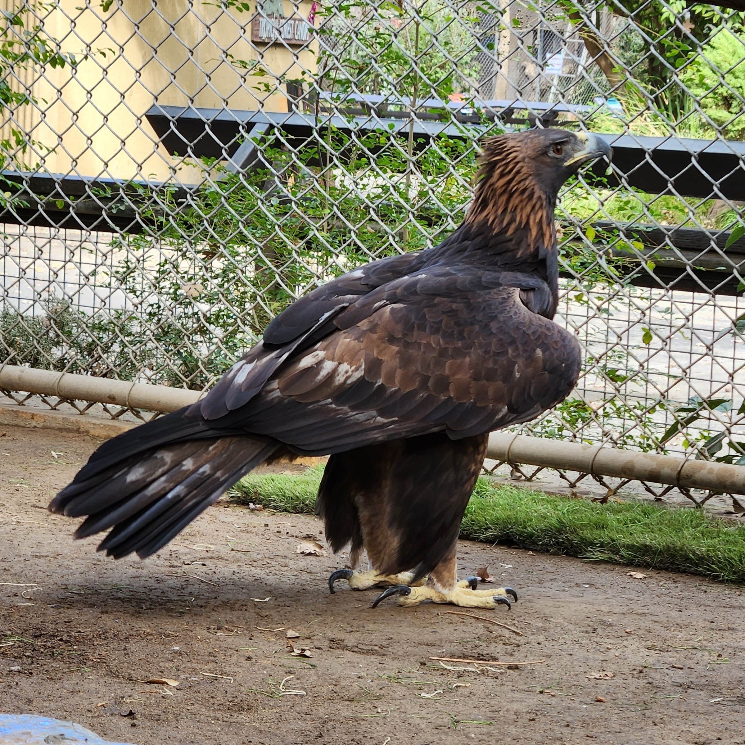 Golden Eagles are birds of prey and are closely related to hawks, vultures, falcons, and kites. Their plumage is mostly dark brown with creamish white wings and tails tipped with black light brown and creamish white legs. Their heads and the sides and napes of their necks and nape are golden brown giving them their name. Golden Eagles have white featherless eye patches, black bills, yellow ceres, and feet. Their well-developed talons and hooked bills help them hunt and tear their meat to more effectively. Since they have a large range distribution, their plumage can vary due to different color morphs.