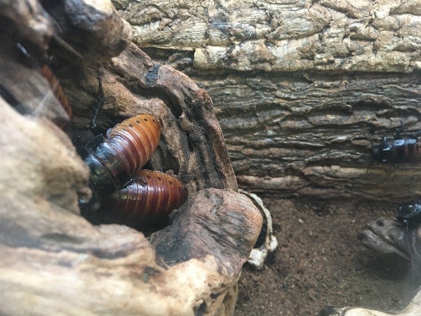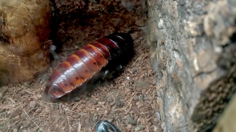 Madagascar Hissing Cockroaches also known as hissers are one of the largest species of cockroaches in the world reaching a length of three inches. They have a rust and black-colored segmented thorax and abdomen. Their exoskeleton is thick and hard and their heads, antennae, and legs are black in color. Unlike most other cockroaches, the Madagascar Hissing Cockroaches are wingless. Their feet have hooks on them that help them climb smooth surfaces. They are active by night (nocturnal).
