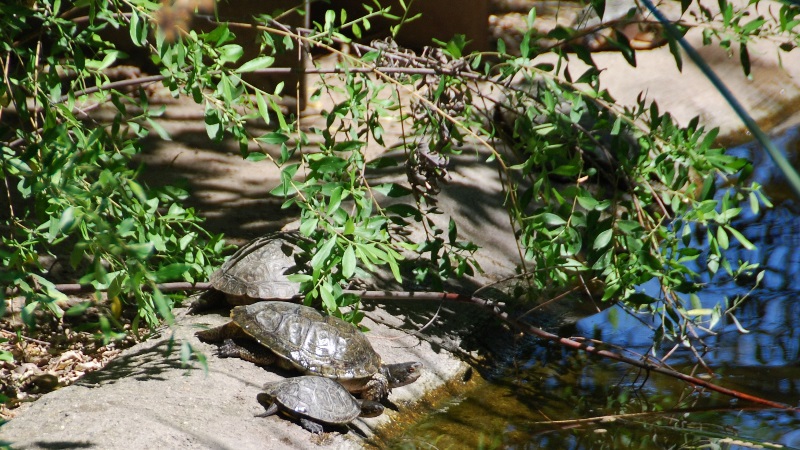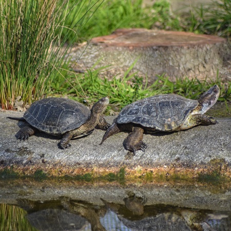 Since wild Western Pond Turtles’ population numbers are still in decline, the International Union for the Conservation of Nature has categorized them as Vulnerable. The main factors that influence their population decline are, habitat destruction and fragmentation due to human pressure, pet trade, natural disasters caused by drought, fires, and flooding, and competition with invasive species such as the red-eared sliders. The U.S. federal government has not added this species to its endangered species list due to the dearth of scientific research on this species. In the last 20 years, this species has been considered extinct in Canada. In the states of Washington and Oregon where their wild population numbers have depleted considerably, they are listed as endangered and sensitive with critical standing respectively. The California Department of Fish and Wildlife have also listed them as species of special concern. Since the mortality rate of turtle hatchlings is high, to conserve the species the state forest departments of California, Oregon, and Washington collaborated with some universities and zoos within their states 20 years ago to start the head-start program. This program focuses on the collection of turtle eggs from the wild that are taken to zoos where they are incubated. Hatchlings are protected from natural predatory pressures and reintroduced to their respective wild habitats when they are larger and less likely to be predated upon.