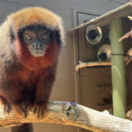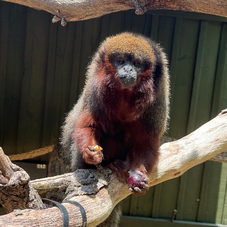 Coppery Titis form long term bonds and mating pairs live together with several generations of young. One infant is born every year between November and March. The young are weaned when they are about four months old. Males are the primary caregivers and predominantly take care of the infants. They commence their parental role a few hours after the infant is born, carrying them around and protecting them. The female’s only parental care role is nursing the infant.