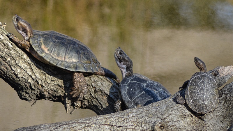 The Western Pond Turtle also called the Pacific Pond Turtle, lives along the Pacific Coast of North America. Like the tortoises, these turtles have smooth shells, but of a sleeker build, that protects them from predators. Since turtles spend a considerable proportion of their time swimming in the water, their sleeker bodies help them swim more efficiently. They have olive green or dark brown carapaces with pale yellow plastrons. Their legs and necks are olive green or dark brown speckled with pale yellow. They have blunt heads that look like tapering handles and well-developed legs. Their carapaces are usually around ¾ of a foot in length and they weigh about two and a half pounds.